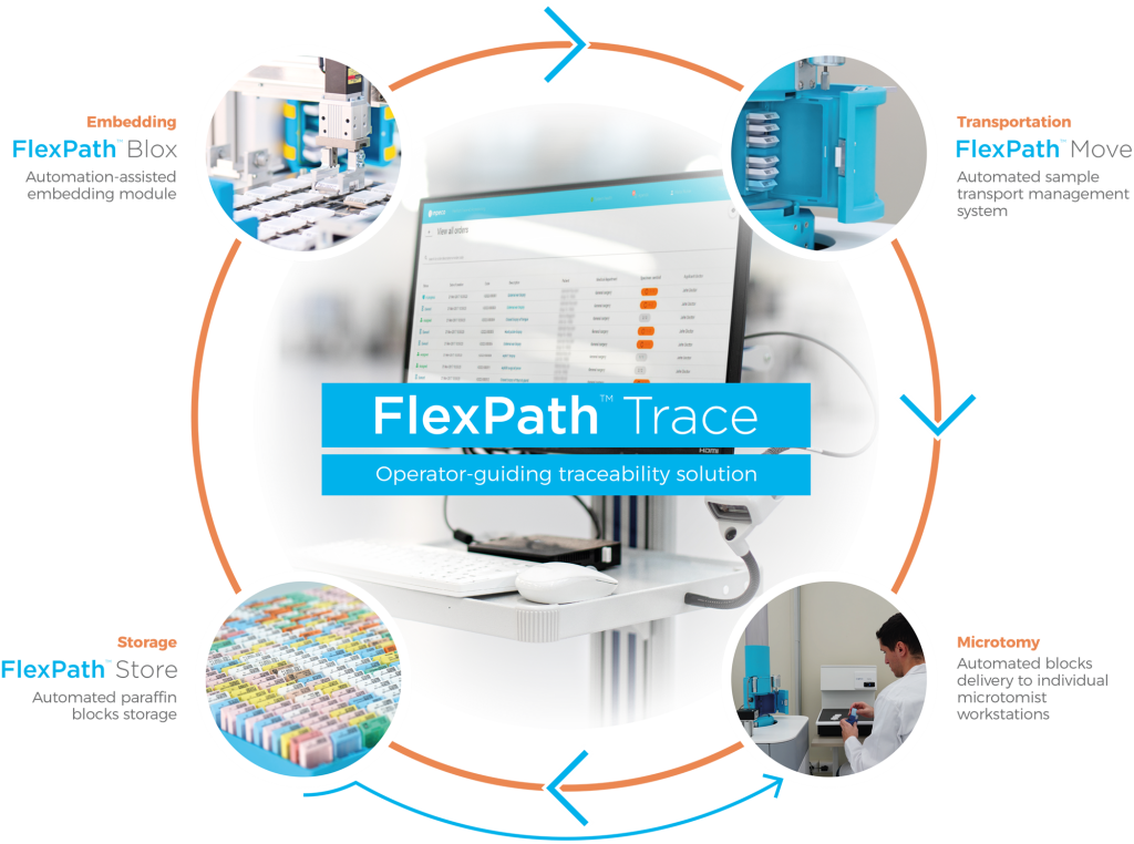 FlexPath™ Trace är ett avancerat spårbarhetssystem för hantering av laboratorieprover inom klinisk patologi. Systemet säkerställer att varje prov kan följas genom hela arbetsflödet, från provtagning till arkivering.